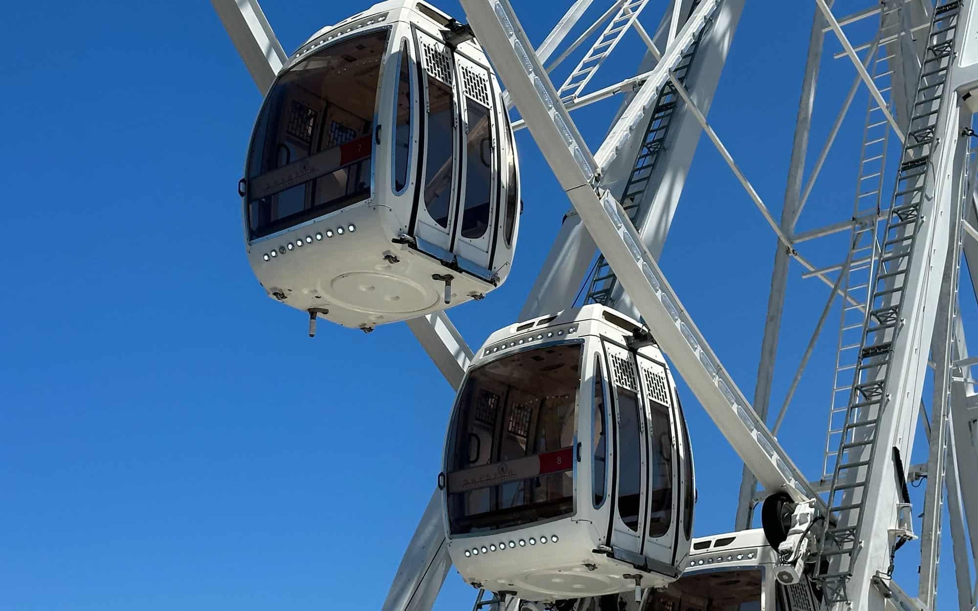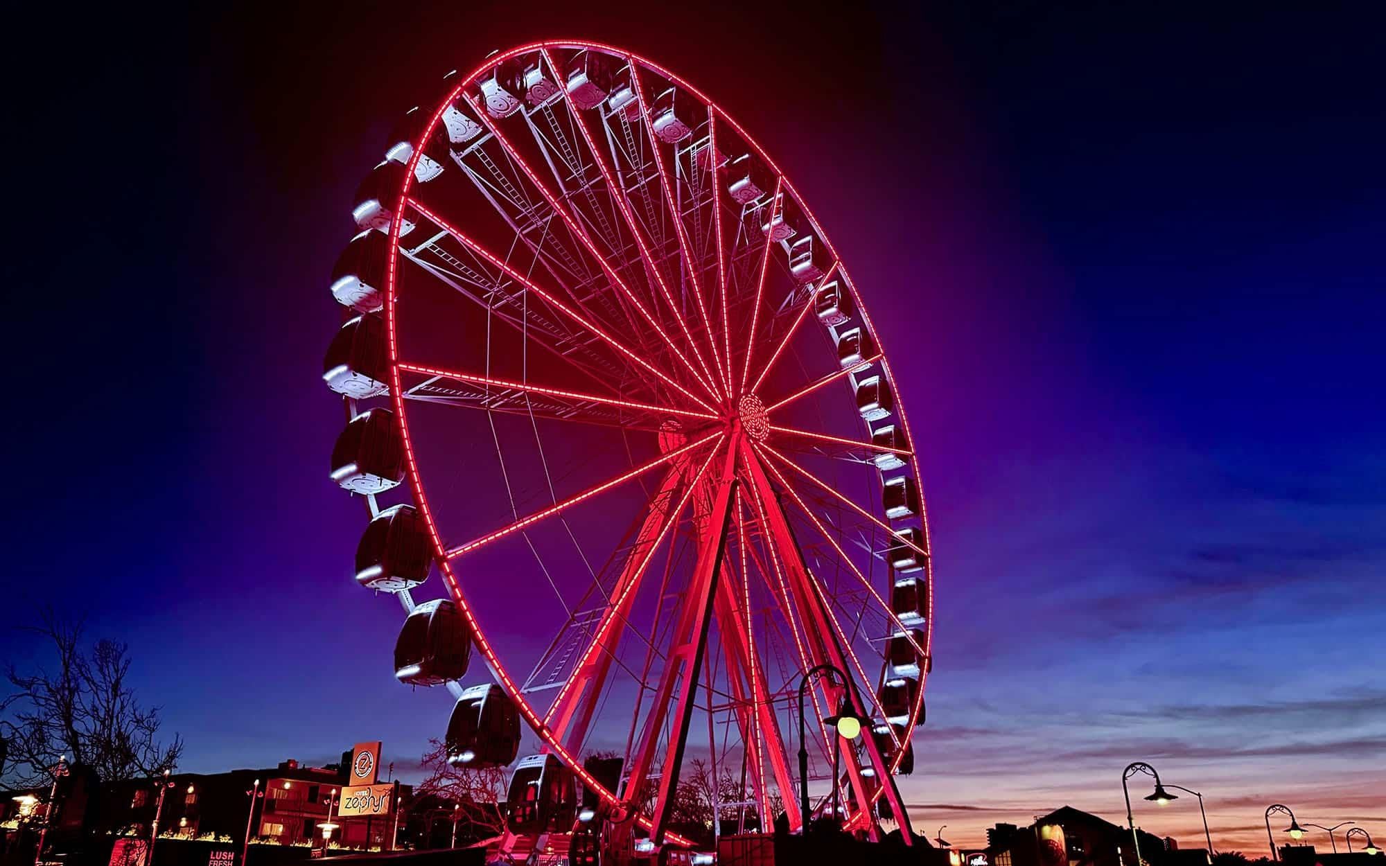 The Ferris wheel can accommodate 1–6 adults inside each gondola. All riders ages two (2) and above must have their own ticket. Children under 2 years old may sit on an adult's lap.
